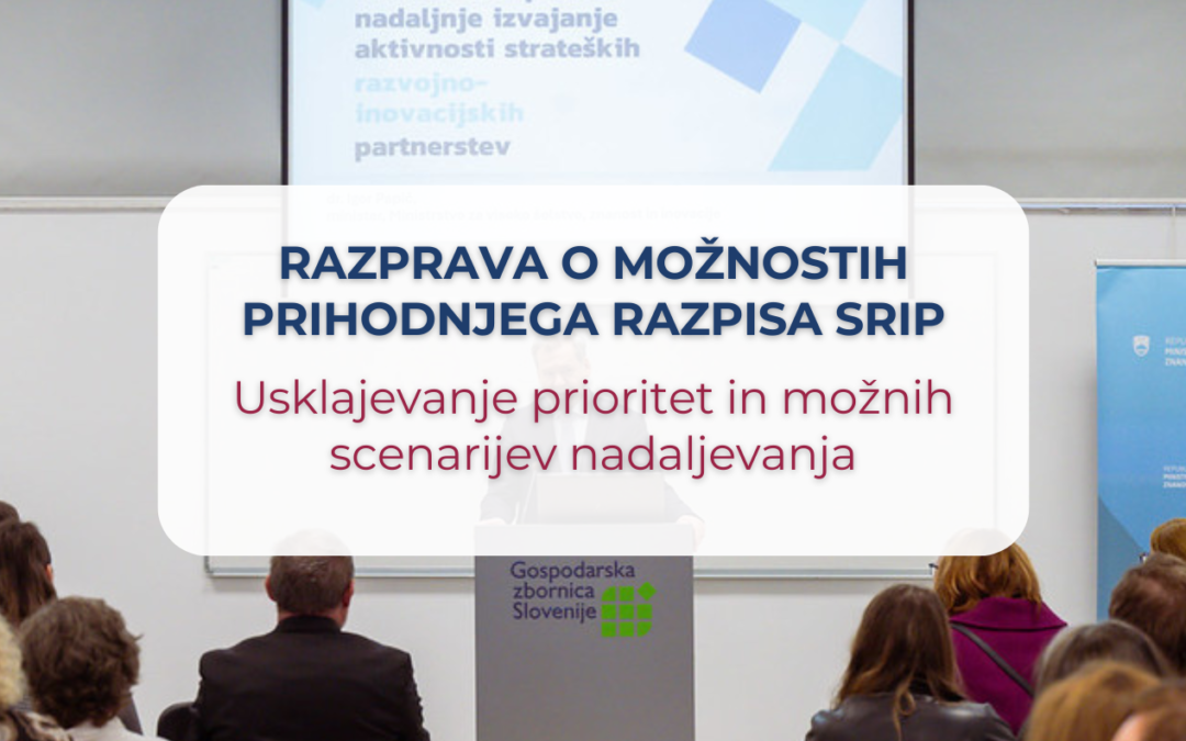 Na Gospodarski zbornici Slovenije je 9. februarja 2026 potekal posvet o razpisu za nadaljnje izvajanje aktivnosti strateških razvojno-inovacijskih partnerstev (SRIP). Dogodek je bil namenjen predstavitvi izhodišč prihodnjega razpisa, izmenjavi pogledov na nadaljnje delovanje SRIP-ov ter razpravi o pričakovanjih glede vsebinskih usmeritev, rezultatov in organizacijskih vidikov izvajanja.